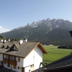 - View on the centre of Toblach and the Dolomites (Sarlkofel) – balcony with view on the “Neunergruppe” – Dolomites